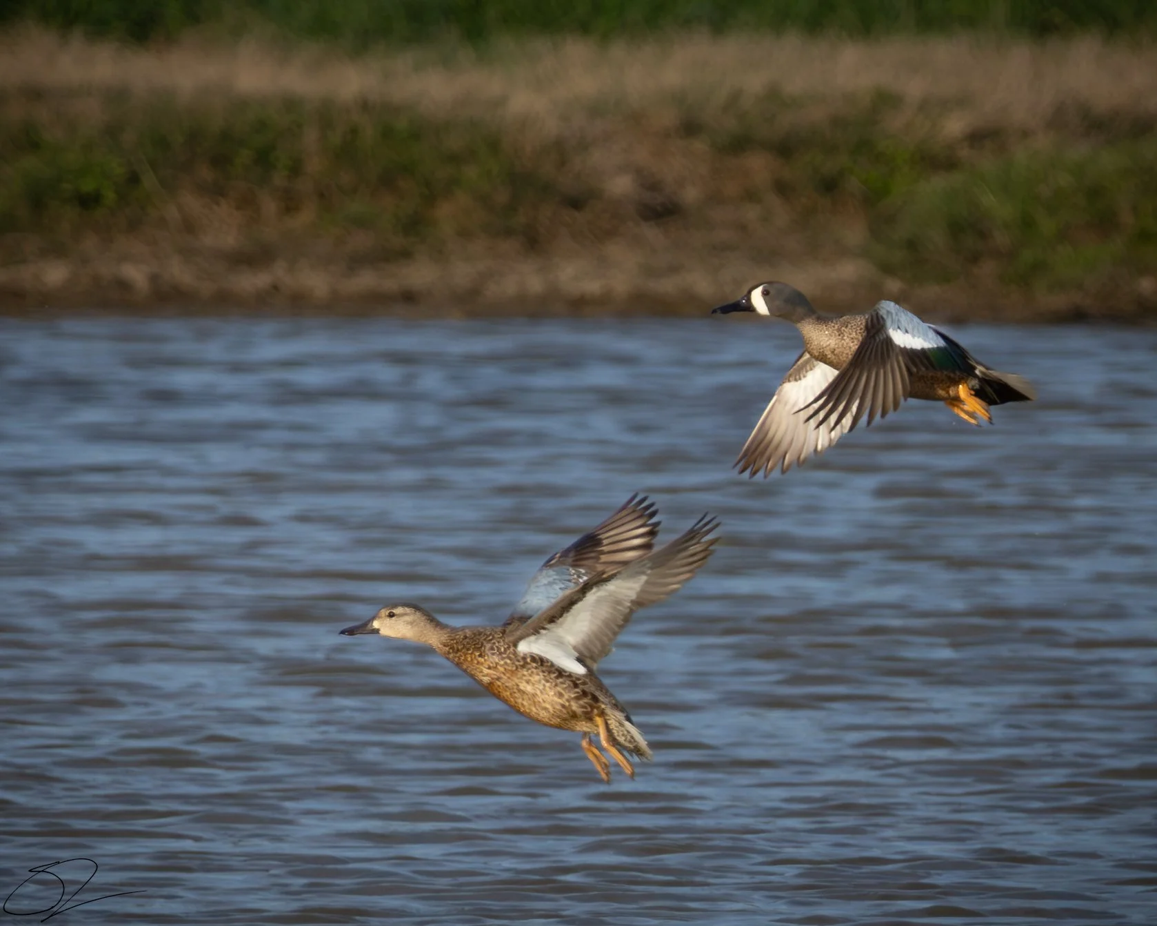 Two ducks in mid-flight over a body of water. View fullsize