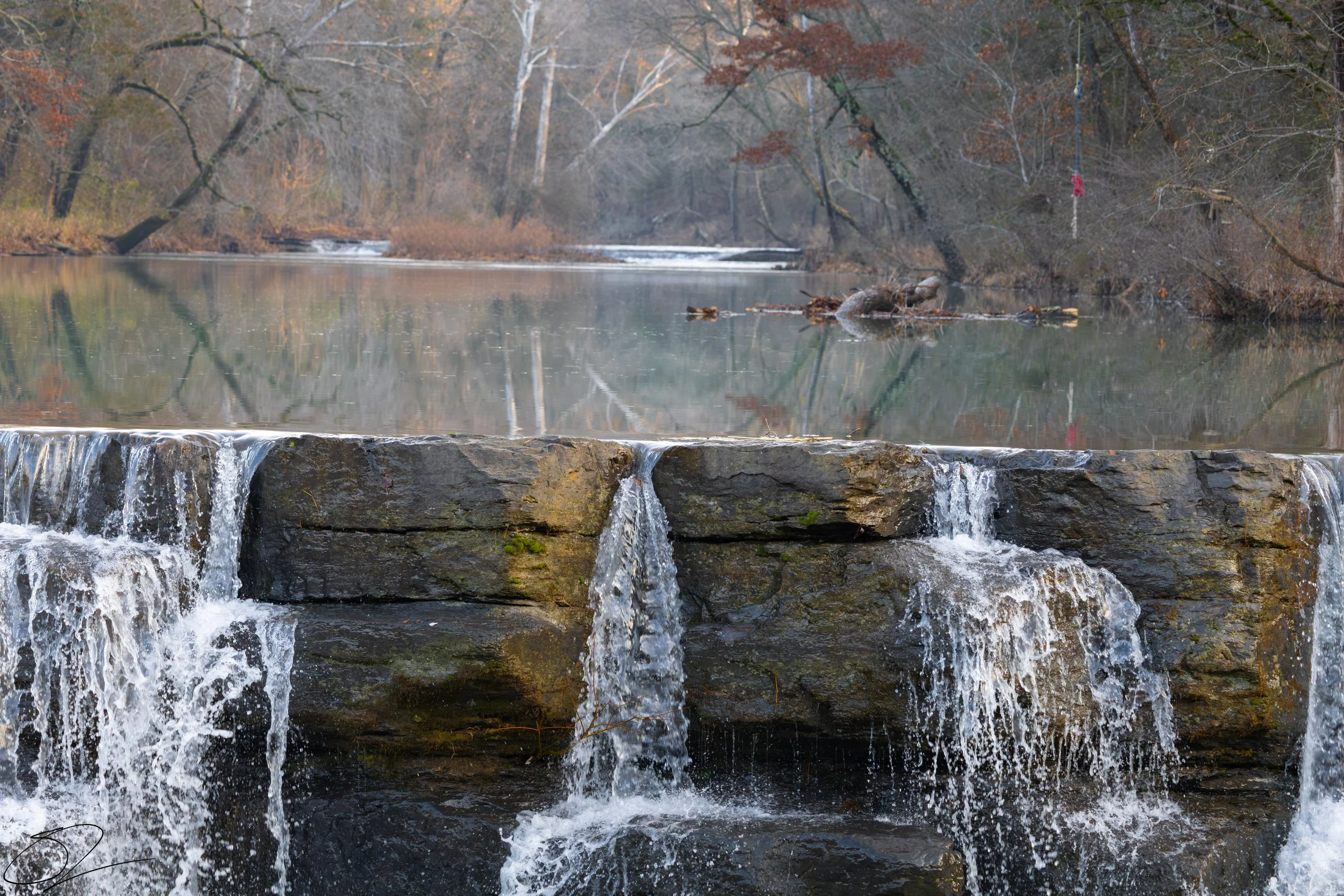 A small waterfall cascading over a stone ledge in a serene river surrounded by autumn trees. View fullsize