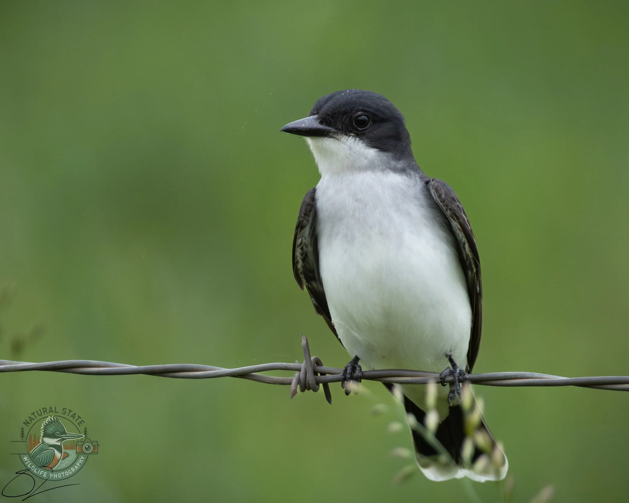 Eastern Kingbird perched on barbed wire against a green background. View fullsize