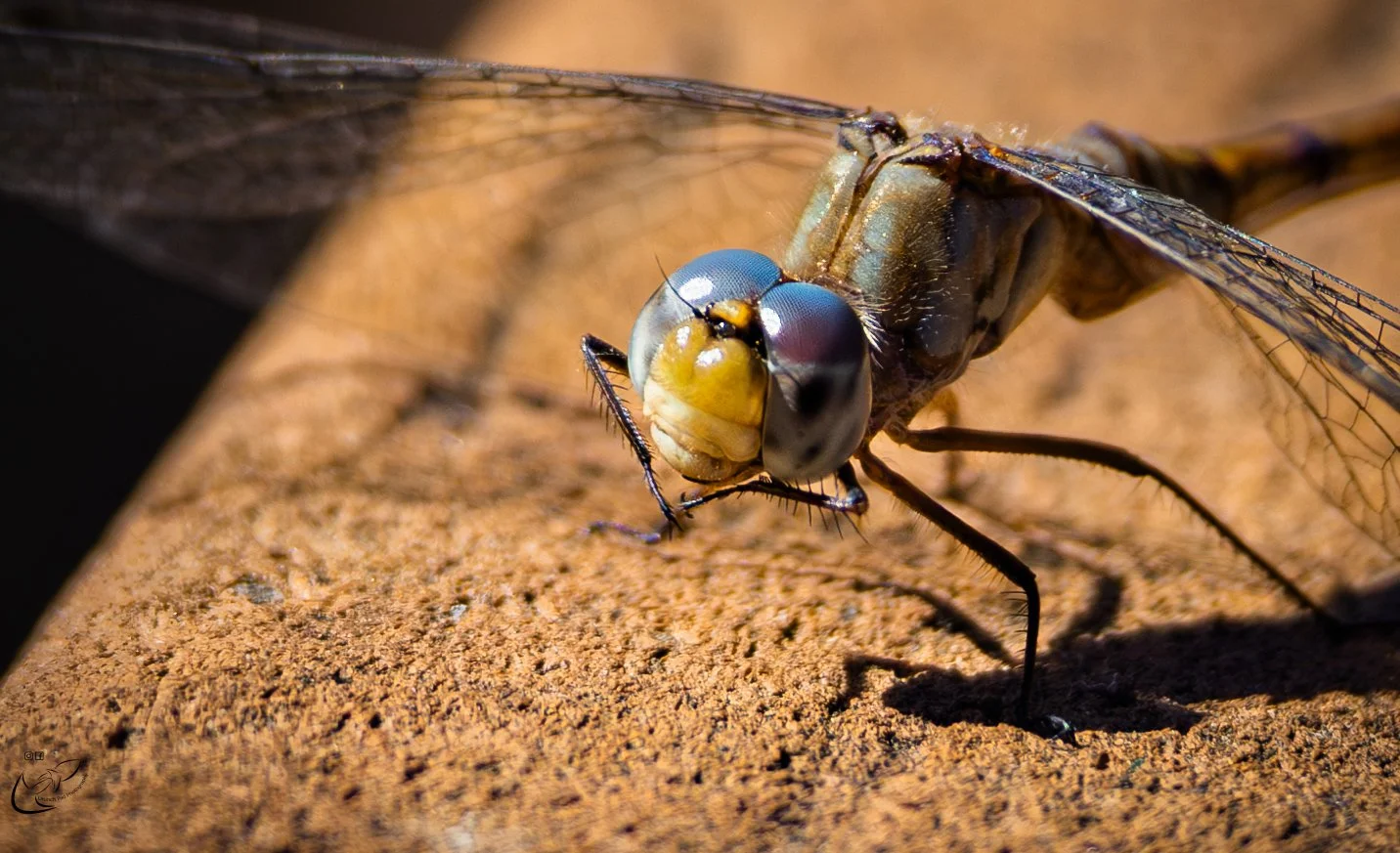 Close-up of a dragonfly with blue eyes and delicate wings perched on a sandy surface. View fullsize