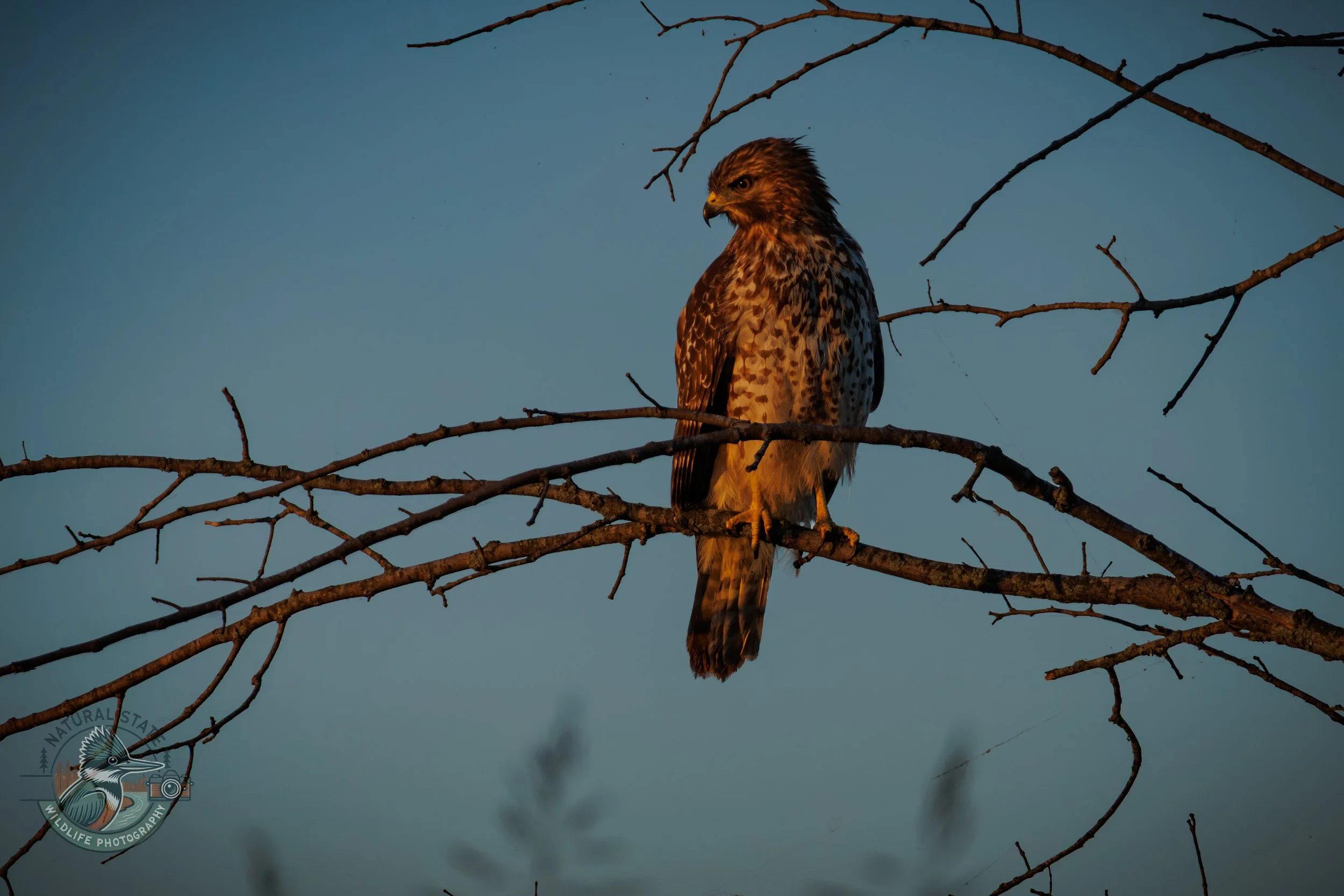 Hawk perched on a bare tree branch against a clear blue sky. View fullsize