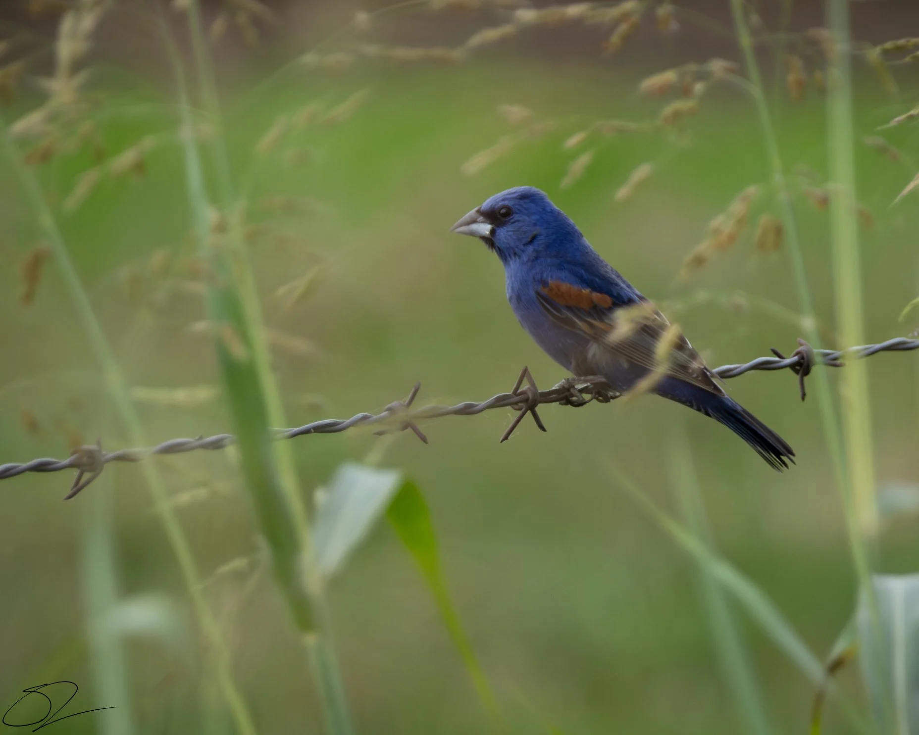 Blue grosbeak perched on barbed wire with grassy background View fullsize