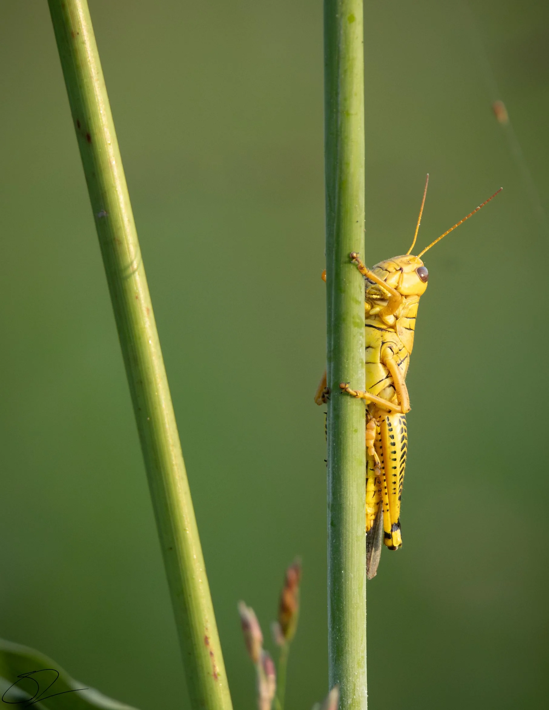 Close-up of a yellow grasshopper clinging to a green stem against a blurred green background. View fullsize