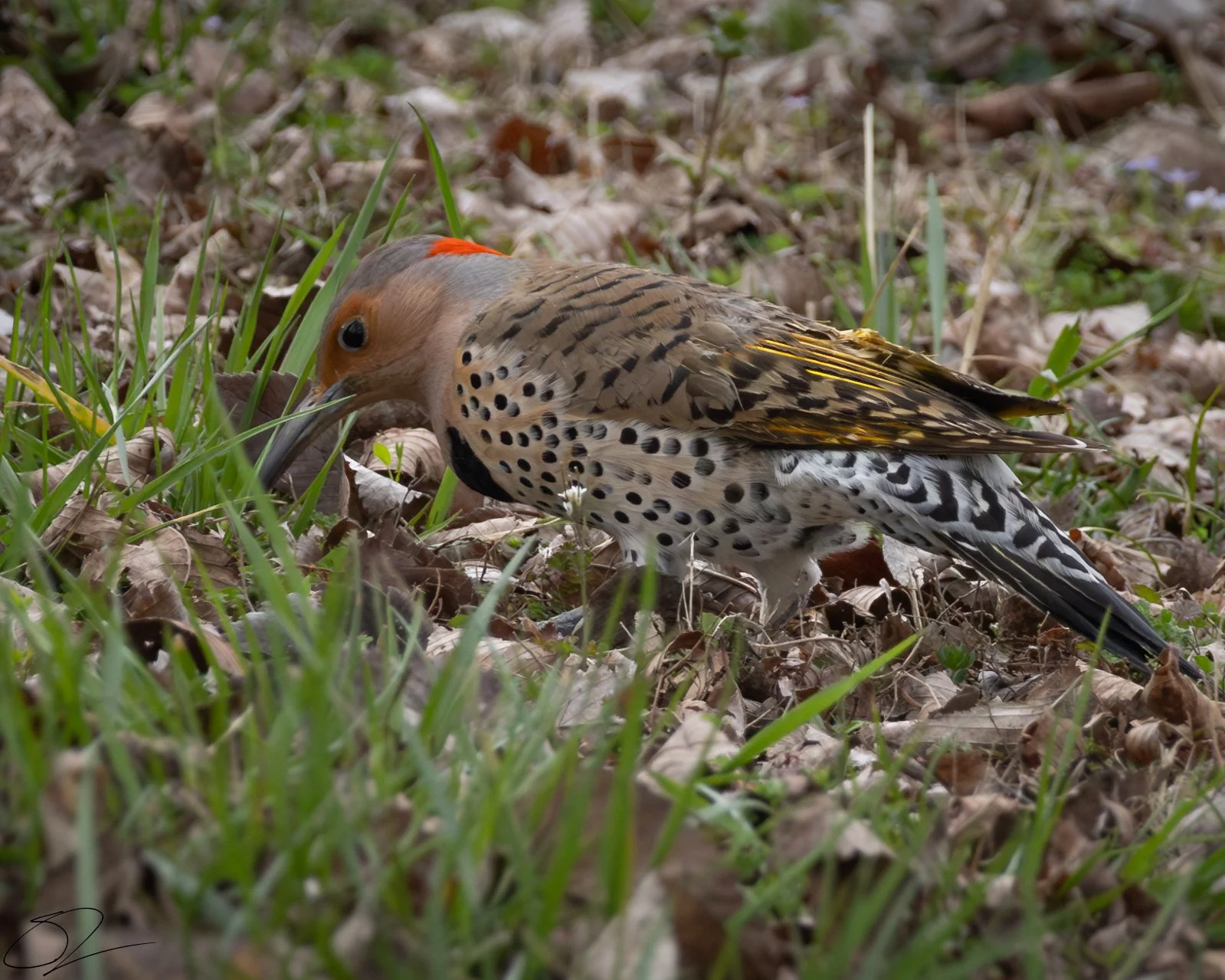 Northern flicker on grass and fallen leaves