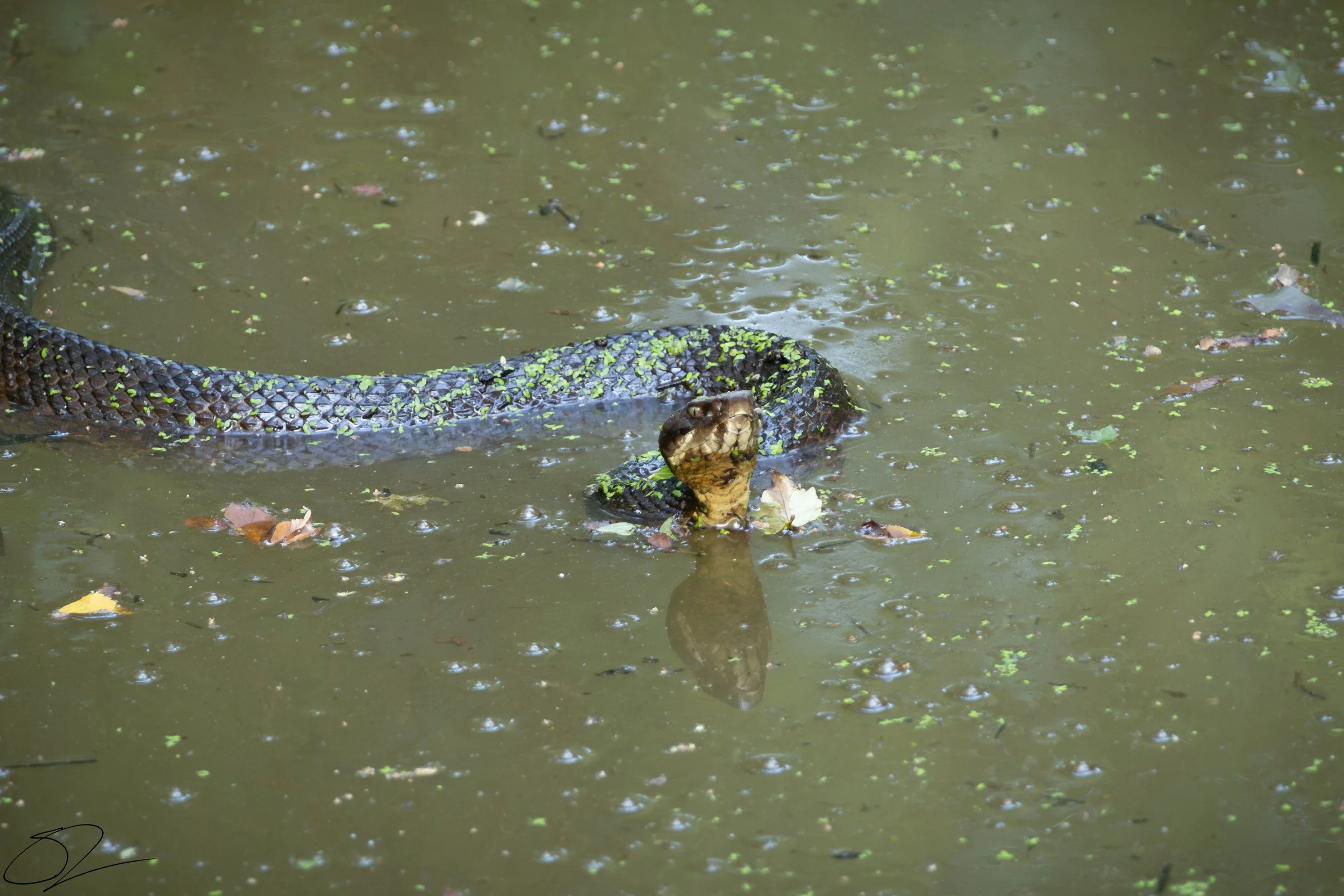 A snake partially submerged in a pond with green water and scattered leaves. View fullsize