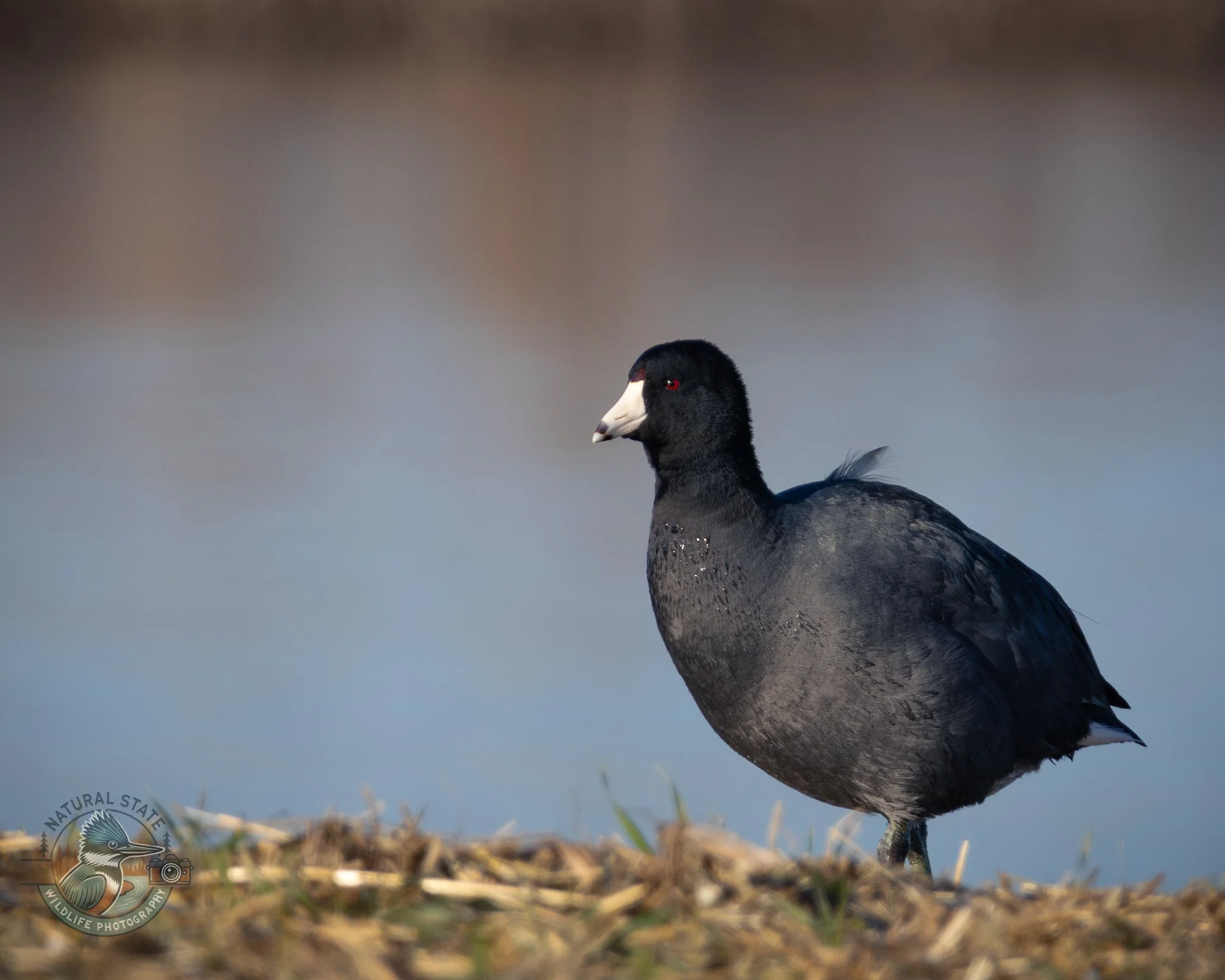American coot standing near a lake with red eyes and white bill.