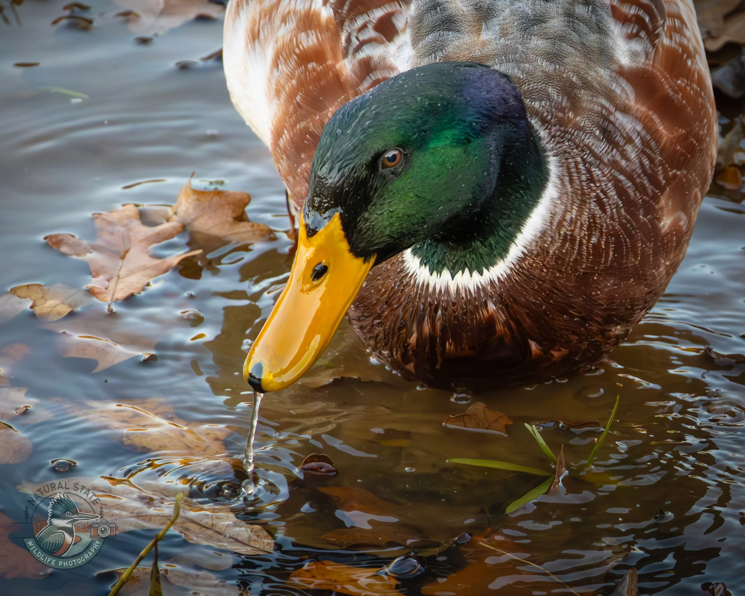 Male mallard duck drinking water from a pond surrounded by fallen leaves. View fullsize
