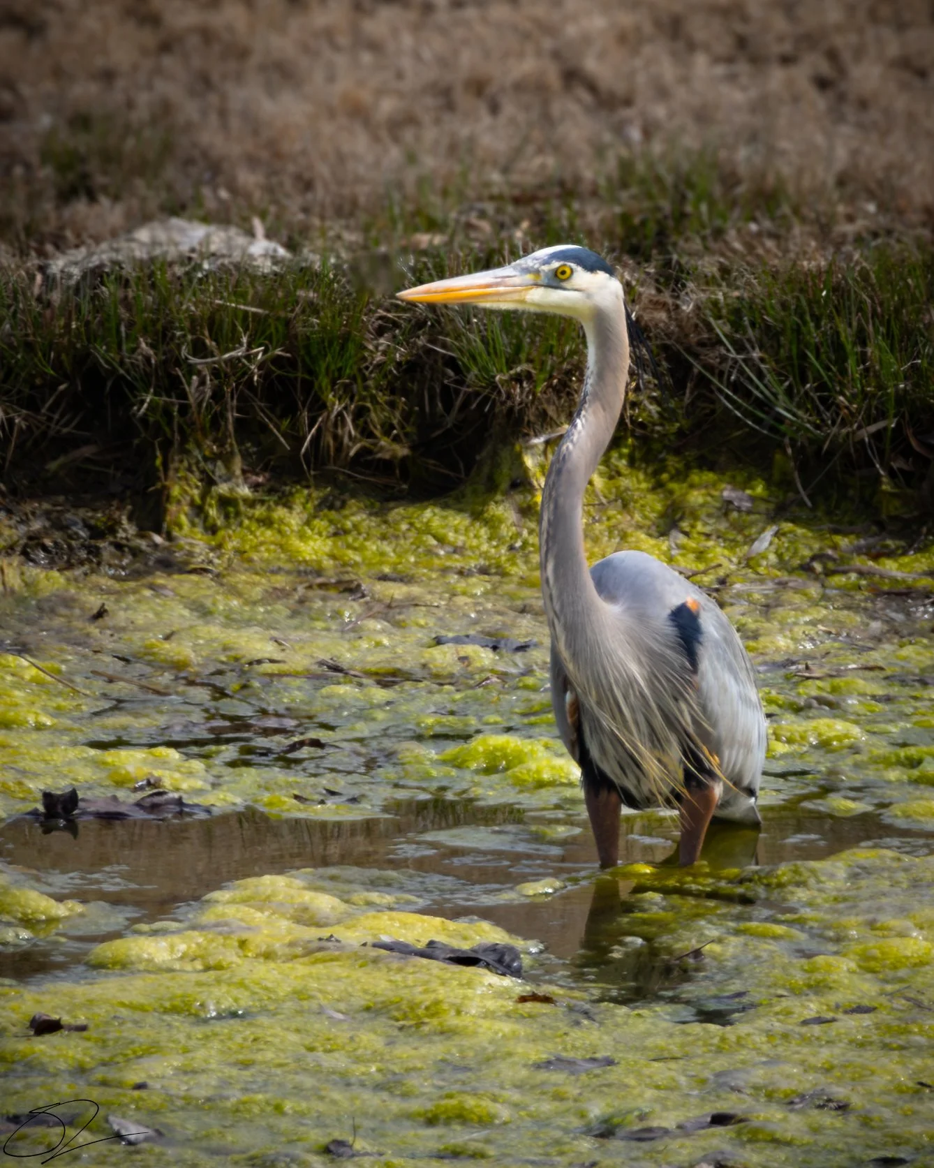 A heron standing in shallow water with green algae and grass nearby. View fullsize