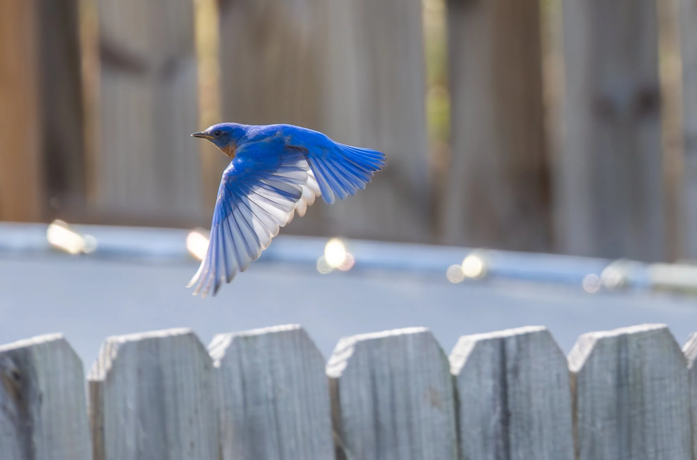 A bluebird flying above a wooden fence. View fullsize