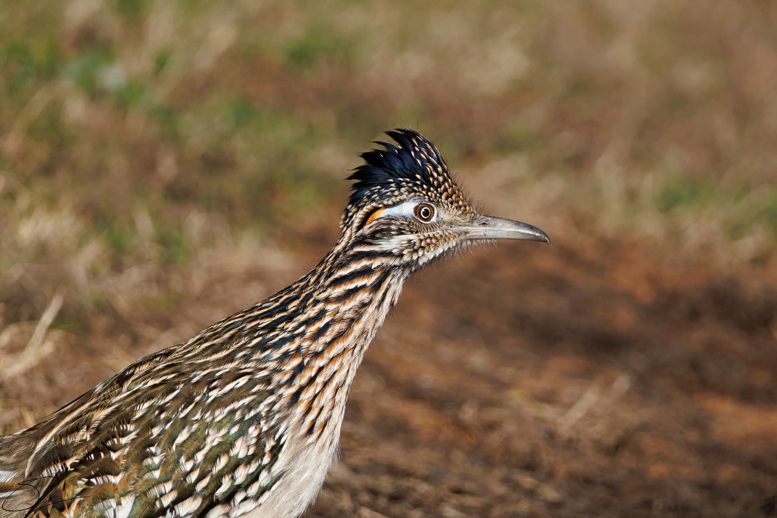 Close-up of a roadrunner with distinct feathers and a grassy blurred background. View fullsize