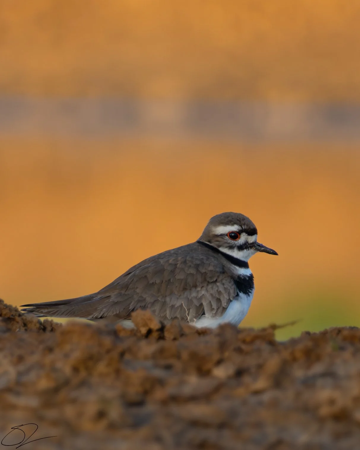 Close-up of a killdeer bird with a brown and white plumage, black bands on the chest, standing on a dirt mound against a blurred orange background. View fullsize