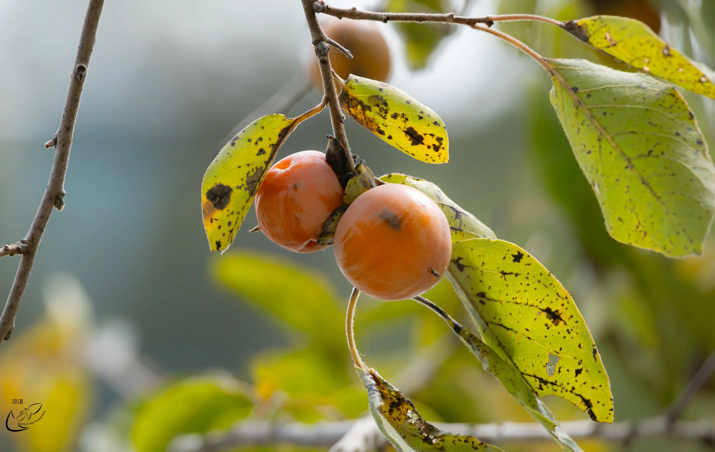 Close-up of ripe persimmons on a branch with green, speckled leaves.