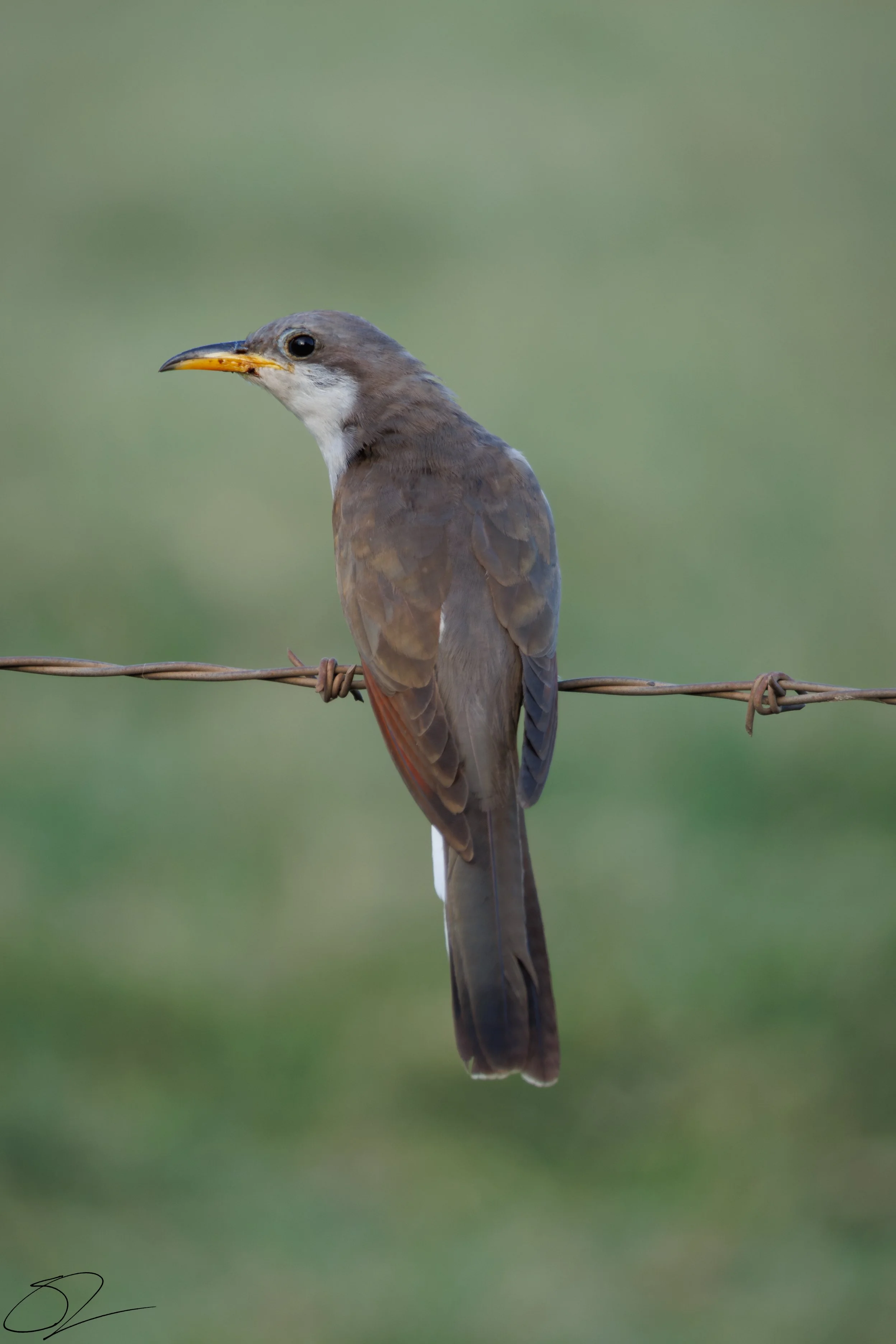 Yellow-billed cuckoo perched on barbed wire against blurred green background. View fullsize
